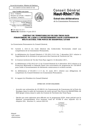 Le présent rapport a pour objet de procéder à l'affectation de l'autorisation de programme du millésime 2013 et d'attribuer une subvention à la Communauté de Communes de la Porte du Sundgau pour l'extension du multi-accueil Tom Pouce de HAGENTHAL LE BAS dans le cadre du contrat de Territoire de Vie des Trois Pays pour un montant de 45 000 €.
