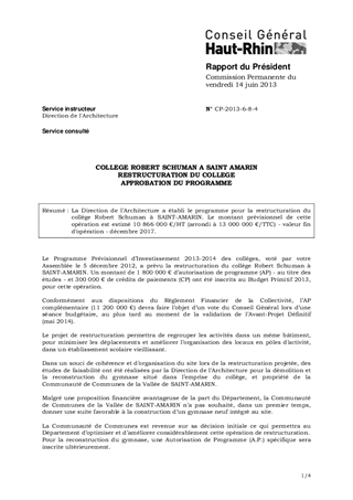 La Direction de l’Architecture a établi le programme pour la restructuration du collège Robert Schuman à SAINT-AMARIN. Le montant prévisionnel de cette opération est estimé 10 866 000 €/HT (arrondi à 13 000 000 €/TTC) - valeur fin d’opération - décembre 2017.