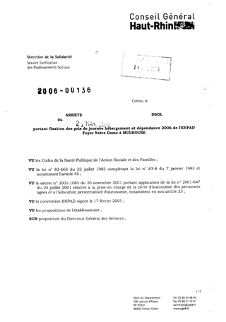 portant fixation des prix de journée hébergement et dépendance 2006 de l'EHPAD foyer Notre Dame à MULHOUSE. Resumé Pièces jointes ARRETE Assemblée : Non défini Date : 21/03/2006 Rapporteur : Non défini Collectivité : Conseil départemental du Haut-Rhin Direction : Non défini Service : Service de la Tarification des Etablissements Domaine : Prix de Journée Commission :