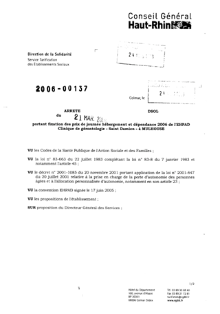portant fixation des prix de journée hébergement et dépendance 2006 de l'EHPAD. Clinique de gérontologie "Saint Damien" à MULHOUSE. Resumé Pièces jointes ARRETE Assemblée : Non défini Date : 21/03/2006 Rapporteur : Non défini Collectivité : Conseil départemental du Haut-Rhin Direction : Non défini Service : Service de la Tarification des Etablissements Domaine : Prix de Journée Commission :