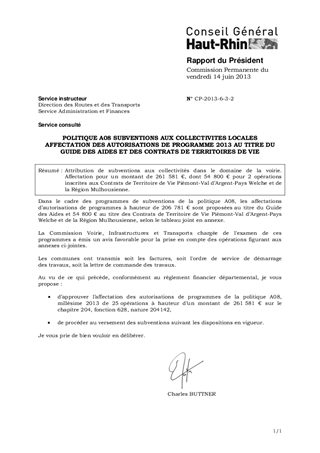 Attribution de subventions aux collectivités dans le domaine de la voirie. Affectation pour un montant de 261 581 €, dont 54 800 € pour 2 opérations inscrites aux Contrats de Territoire de Vie Piémont-Val d’Argent-Pays Welche et de la Région Mulhousienne.