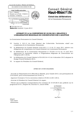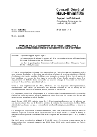 Le présent rapport a pour objet : - d'approuver et de signer l'avenant n°2 à la convention relative à l'Organisation Régionale de Concertation sur l'Adoption, - de fixer la participation financière du Département du Haut-Rhin pour l'année 2013 à 15 619,06 euros.
