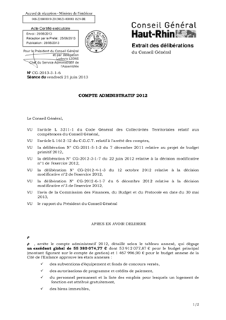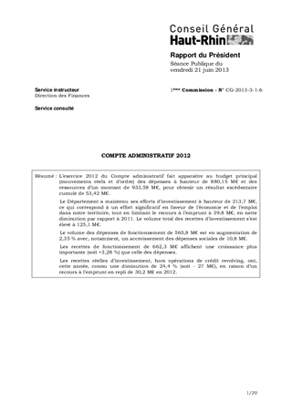 L’exercice 2012 du Compte administratif fait apparaître au budget principal (mouvements réels et d’ordre) des dépenses à hauteur de 880,15 M€ et des ressources d’un montant de 933,58 M€, pour obtenir un résultat excédentaire cumulé de 53,42 M€. Le Département a maintenu ses efforts d’investissement à hauteur de 213,7 M€, ce qui correspond à un effort significatif en faveur de l’économie et de l’emploi dans notre territoire, tout en limitant le recours à l’emprunt à 39,8 M€, en nette diminution par rapport à 2011. Le volume total des recettes d’investissement s’est élevé à 125,1 M€. Le volume des dépenses de fonctionnement de 565,8 M€ est en augmentation de 2,35 % avec, notamment, un accroissement des dépenses sociales de 10,8 M€. Les recettes de fonctionnement de 662,3 M€ affichent une croissance plus importante (soit +3,28 %) que celle des dépenses. Les recettes réelles d’investissement, hors opérations de crédit revolving, ont, cette année, connu une diminution de 24,4 % (soit - 27 M€), en raison d’un recours à l’emprunt en repli de 30,2 M€ en 2012.