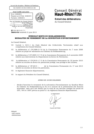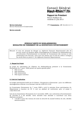 Il vous est proposé de déroger au règlement financier départemental afin de pouvoir verser au Syndicat Mixte d’Aménagement du Château du Hohlandsbourg, la subvention d’investissement en fonction de l’avancement des travaux et sur présentation des factures, sans qu'il soit besoin que le total de celles-ci atteigne les seuils fixés au point 6.1 du règlement financier départemental.