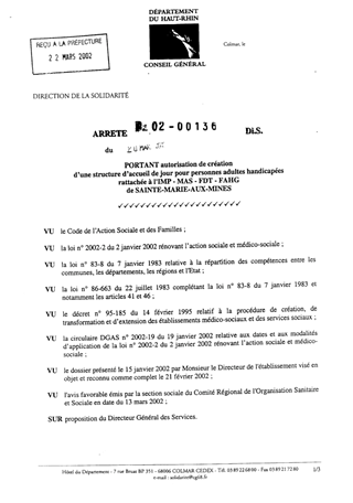 Portant autorisation de création d'une structure d'accueil de jour pour personnes adultes handicapées rattachée à l'IMP - AMS - FDT - FAHG de SAINTE MARIE AUX MINES Resumé Pièces jointes ARRETE Assemblée : Non défini Date : 20/03/2002 Rapporteur : Non défini Collectivité : Conseil départemental du Haut-Rhin Direction : Non défini Service : Direction de la Solidarité Domaine : Autres (non classés) Commission :