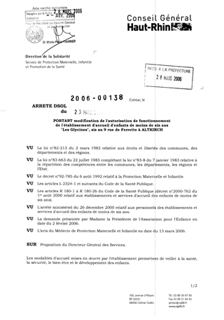 portant modification de l'autorisation de fonctionnement de l'établissement d'accueil d'enfants de moins de six ans "Les Glycines", sis au 9 rue de Ferrette à ALTKIRCH. Resumé Pièces jointes ARRETE Assemblée : Non défini Date : 23/03/2006 Rapporteur : Non défini Collectivité : Conseil départemental du Haut-Rhin Direction : Non défini Service : Service de Protection Maternelle et Infantile Domaine : Accueil d'enfants Commission :