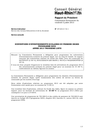 La Commission Permanente a délégation pour programmer les subventions d’investissements scolaires du premier degré, tout au long de l’année. Ce rapport concerne des subventions relevant du Guide des Aides, pour les communes de HATTSTATT (2 307 €), SOULTZBACH-LES-BAINS (1 803 €) et WALDIGHOFFEN (6 257 €). Il vous est donc proposé d’approuver la troisième liste de subventions du programme 2013 des investissements scolaires du premier degré pour un montant de 10 367 €, conformément au tableau figurant en annexe.