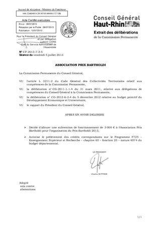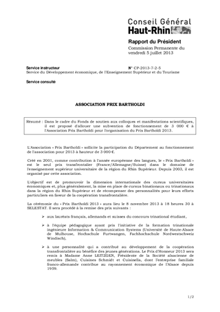 Dans le cadre du Fonds de soutien aux colloques et manifestations scientifiques, il est proposé d'allouer une subvention de fonctionnement de 3 000 € à l'Association Prix Bartholdi pour l'organisation du Prix Bartholdi 2013.