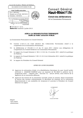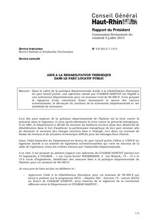 Dans le cadre de la politique départementale d'aide à la réhabilitation thermique du parc locatif public, une opération menée par COLMAR HABITAT est éligible à une subvention départementale pour un montant total de 96 000 €. Il est proposé la signature d'une convention fixant notamment la nature des travaux subventionnés, le décompte du montant de la subvention départementale et ses modalités de versement