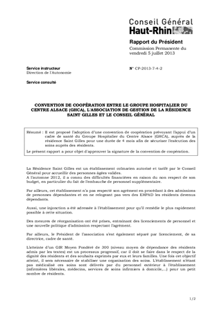II est proposé l’adoption d’une convention de coopération prévoyant l’appui d’un cadre de santé du Groupe Hospitalier du Centre Alsace (GHCA), auprès de la résidence Saint Gilles pour une durée de 4 mois afin de sécuriser l’exécution des soins auprès des résidents. Le présent rapport a pour objet d'approuver la signature de la convention de coopération.