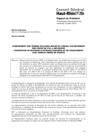 Réseau Ferré de France (RFF) et le Département ont réalisé des travaux sur le site dit Cockrouri à Mulhouse. Les 2 chantiers ont généré des terres polluées qui ont été stockées sur place. RFF souhaite confier au Département la maîtrise d’ouvrage des travaux de confinement de ces terres polluées dans le cadre de la convention jointe en annexe au rapport, qui fixe également la répartition des charges financières de ce chantier. Le montant estimatif des travaux s'élève à 178 200 € HT, dont 110 000 € HT à la charge de RFF et 68 200 € HT à la charge du Département. Il vous est proposé d'approuver la convention de maîtrise d’ouvrage désignée et de financement entre RFF et le Département.