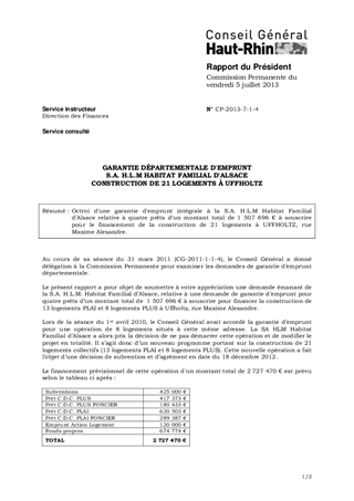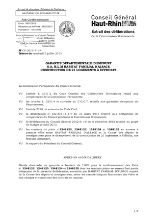 GARANTIE DÉPARTEMENTALE D'EMPRUNT S.A. H.L.M HABITAT FAMILIAL D'ALSACE CONSTRUCTION DE 21 LOGEMENTS À UFFHOLTZ