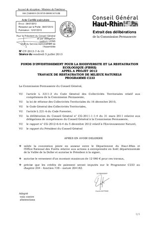 Le Département du Haut-Rhin et l’Office National des Forêts (ONF) ont souhaité développer un partenariat commun dans le cadre de l’appel à projets 2012 « travaux de restauration des milieux naturels » lancé par l’Etat au titre du Fonds d’investissement pour la biodiversité et la restauration écologique (FIBRE). Il concerne un projet de restauration de l’habitat du Grand Tétras dans le massif vosgien. Ce partenariat prendra la forme d’une délégation de maîtrise d’ouvrage accordée par le Département à l’ONF par le biais d’une convention jointe en annexe et concernera des actions réalisées en forêt départementale de la vallée de la Doller. La contribution départementale sera de 12 080 €, soit 20 % du coût total, le reste étant financé par la subvention FIBRE. Je vous propose de valider la convention avec l’ONF, de m’autoriser à la signer et à verser cette contribution..