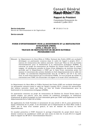 FONDS D'INVESTISSEMENT POUR LA BIODIVERSITE ET LA RESTAURATION ECOLOGIQUE (FIBRE) APPEL A PROJET 2012 TRAVAUX DE RESTAURATION DE MILIEUX NATURELS PROGRAMME C233
