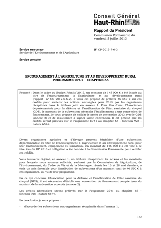 Dans le cadre du Budget Primitif 2013, un montant de 145 000 € a été inscrit au titre de l’encouragement à l’agriculture et au développement rural (rapport n° CG 2012-6-6-2). Il vous est proposé de prélever 46 550 € sur ces crédits pour soutenir les actions envisagées pour 2013 par les organismes récapitulés dans le tableau joint en annexe 1. Pour l’un d’eux, l’Association départementale pour la défense et l’amélioration de l’état sanitaire du cheptel (GDS), le montant de la subvention nécessite l’établissement d’une convention de financement. Je vous propose de valider le projet de convention 2013 avec le GDS (annexe 2) et de m’autoriser à signer ladite convention. Il est précisé que les crédits seront prélevés sur le Programme C741 au chapitre 65 – fonction 928 – nature 6574.