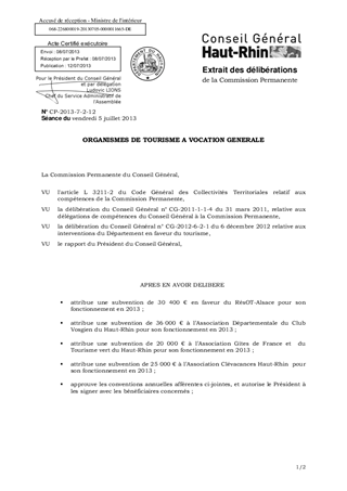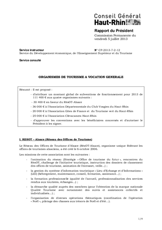 Il est proposé : - d’attribuer un montant global de subventions de fonctionnement pour 2013 de 111 400 € aux quatre organismes suivants : - 30 400 € en faveur du RésOT-Alsace - 36 000 € à l’Association Départementale du Club Vosgien du Haut-Rhin - 20 000 € à l’Association Gîtes de France et du Tourisme vert du Haut-Rhin - 25 000 € à l’Association Clévacances Haut-Rhin - d’approuver les conventions avec les bénéficiaires concernés et d’autoriser le Président à les signer.