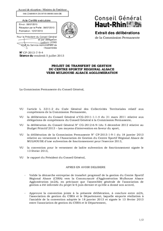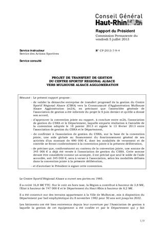 PROJET DE TRANSFERT DE GESTION DU CENTRE SPORTIF REGIONAL ALSACE VERS MULHOUSE ALSACE AGGLOMERATION