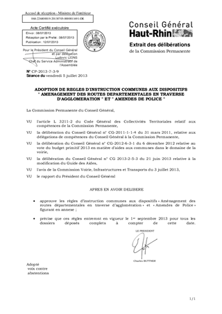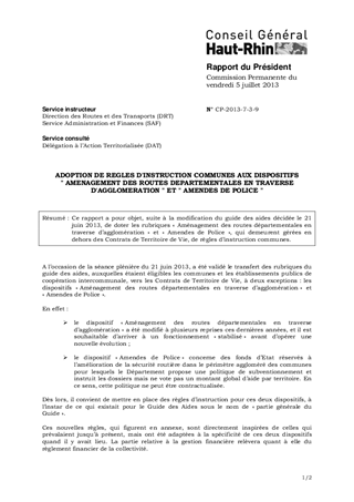 Ce rapport a pour objet, suite à la modification du guide des aides décidée le 21 juin 2013, de doter les rubriques « Aménagement des routes départementales en traverse d’agglomération » et « Amendes de Police », qui demeurent gérées en dehors des Contrats de Territoire de Vie, de règles d’instruction communes.
