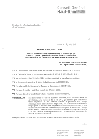 portant réglementation permanente de la circulation sur la RD 201 (route à grande circulation), hors agglomération, sur le territoire des communes de HEGENHEIM et HESINGUE. Resumé Pièces jointes ARRETE Assemblée : Non défini Date : 30/03/2006 Rapporteur : Non défini Collectivité : Conseil départemental du Haut-Rhin Direction : Non défini Service : Direction des Routes Domaine : Circulation Commission :