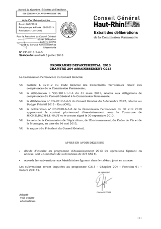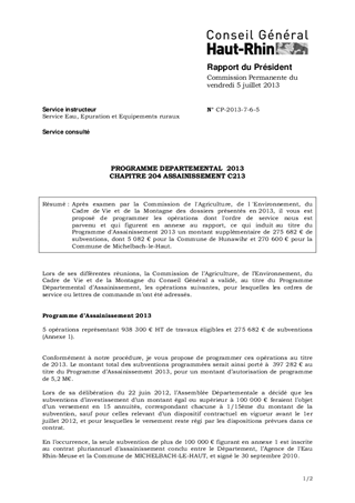 Après examen par la Commission de l'Agriculture, de l 'Environnement, du Cadre de Vie et de la Montagne des dossiers présentés en 2013, il vous est proposé de programmer les opérations dont l'ordre de service nous est parvenu et qui figurent en annexe au rapport, ce qui induit au titre du Programme d'Assainissement 2013 un montant supplémentaire de 275 682 € de subventions, dont 5 082 € pour la Commune de Hunawihr et 270 600 € pour la Commune de Michelbach-le-Haut.