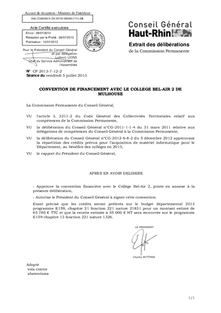 Le présent rapport a pour objet d'autoriser la signature d'une convention financière avec le collège Bel-Air 2 de MULHOUSE afin de permettre l'achat d'équipements informatiques supplémentaires souhaités par le conseil pédagogique du collège pour un montant estimé à 65 780 € TTC. En contrepartie, le collège remboursera au Département les sommes engagées.