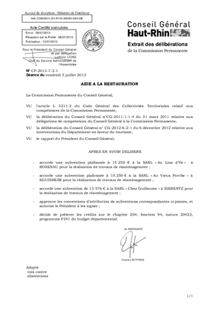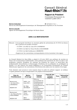 Il est proposé d'attribuer un montant global de subventions de 44 076 € en faveur des 3 porteurs de projets suivants : - 15 250 € à la Sàrl au Lion d'Or à ROSENAU - 15 250 € à la Sàrl Au Vieux Porche à EGUISHEIM - 13 576 € à la Sàrl Guillaume à SIERENTZ d'approuver les conventions correspondantes et de m'autoriser à les signer.
