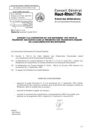 AVENANT À LA CONVENTION DU 1ER SEPTEMBRE 1993 POUR LE TRANSPORT DES ÉLÈVES DANS LE PÉRIMÈTRE DES TRANSPORTS URBAINS DE L'AGGLOMÉRATION MULHOUSIENNE
