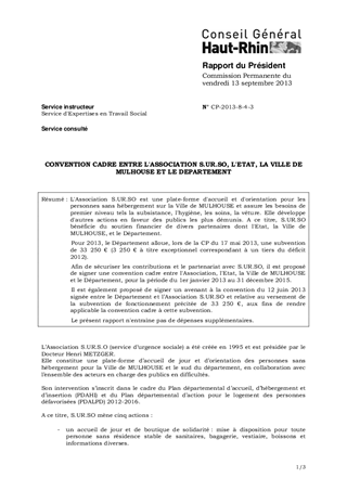 L'Association S.UR.SO est une plate-forme d'accueil et d'orientation pour les personnes sans hébergement sur la Ville de MULHOUSE et assure les besoins de premier niveau tels la subsistance, l'hygiène, les soins, la vêture. Elle développe d'autres actions en faveur des publics les plus démunis. A ce titre, S.UR.SO bénéficie du soutien financier de divers partenaires dont l'Etat, la Ville de MULHOUSE, et le Département. Pour 2013, le Département alloue, lors de la CP du 17 mai 2013, une subvention de 33 250 € (3 250 € à titre exceptionnel correspondant à un tiers du déficit 2012). Afin de sécuriser les contributions et le partenariat avec S.UR.SO, il est proposé de signer une convention cadre entre l'Association, l'Etat, la Ville de MULHOUSE et le Département, pour la période du 1er janvier 2013 au 31 décembre 2015. Il est également proposé de signer un avenant à la convention du 12 juin 2013 signée entre le Département et l’Association S.UR.SO et relative au versement de la subvention de fonctionnement précitée de 33 250 €, aux fins de rendre applicable la convention cadre à cette subvention. Le présent rapport n'entraîne pas de dépenses supplémentaires.