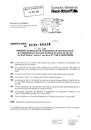 portant modification de l'autorisation de fonctionnement de l'établissement d'accueil d'enfants de moins de six ans "Le Petit Prince", sis au 1 rue de la 5ème DB à LAPOUTROIE. Resumé Pièces jointes ARRETE Assemblée : Non défini Date : 07/04/2006 Rapporteur : Non défini Collectivité : Conseil départemental du Haut-Rhin Direction : Non défini Service : Service de Protection Maternelle et Infantile Domaine : Accueil d'enfants Commission :