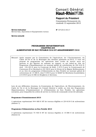 Après examen par la Commission de l'Agriculture, de l 'Environnement, du Cadre de Vie et de la Montagne des dossiers présentés en 2013, il vous est proposé de programmer les opérations dont l'ordre de service nous est parvenu et qui figurent en annexes au rapport, ce qui induit au titre du Programme d'Assainissement un montant global de subventions de 234 618 €, dont 146 223 € pour la Commune de Bisel, 4 875 € pour la Communauté de Communes Ill et Gersbach et 83 520 € pour le Sivom de la Région Mulhousienne, et au titre du programme d'Alimentation en Eau Potable un montant global de subventions de 15 080 €, dont 9 040 € pour le SIAEP de Merxheim-Gundolsheim et 6 040 € pour le SIE de Bergheim et Environs.