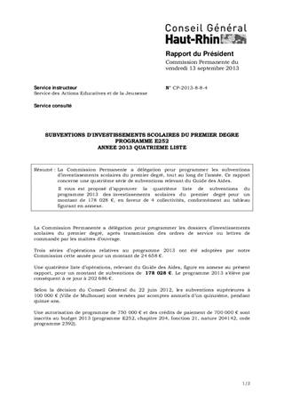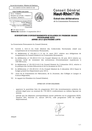 SUBVENTIONS D'INVESTISSEMENTS SCOLAIRES DU PREMIER DEGRE PROGRAMME E252 ANNEE 2013 QUATRIEME LISTE