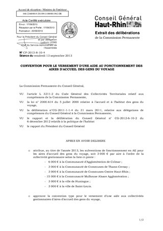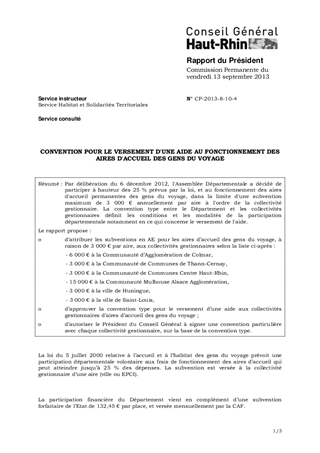 Par délibération du 6 décembre 2012, l'Assemblée Départementale a décidé de participer à hauteur des 25 % prévus par la loi, et au fonctionnement des aires d'accueil permanentes des gens du voyage, dans la limite d'une subvention maximum de 3 000 € annuellement par aire à l'ordre de la collectivité gestionnaire. La convention type entre le Département et les collectivités gestionnaires définit les conditions et les modalités de la participation départementale notamment en ce qui concerne le versement de l'aide. Le rapport propose : o d’attribuer les subventions en AE pour les aires d’accueil des gens du voyage, à raison de 3 000 € par aire, aux collectivités gestionnaires selon la liste ci-après : - 6 000 € à la Communauté d’Agglomération de Colmar, - 3 000 € à la Communauté de Communes de Thann-Cernay, - 3 000 € à la Communauté de Communes Centre Haut-Rhin, - 15 000 € à la Communauté Mulhouse Alsace Agglomération, - 3 000 € à la ville de Huningue, - 3 000 € à la ville de Saint-Louis, o d’approuver la convention type pour le versement d’une aide aux collectivités gestionnaires d’aires d’accueil des gens du voyage ; o d’autoriser le Président du Conseil Général à signer une convention particulière avec chaque collectivité gestionnaire, sur la base de la convention type.