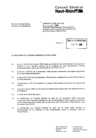 portant déclassement d'une partie du domaine public occupée par les piliers du pont ferroviaire à BARTENHEIM. Resumé Pièces jointes ARRETE Assemblée : Non défini Date : 11/04/2006 Rapporteur : Non défini Collectivité : Conseil départemental du Haut-Rhin Direction : Non défini Service : Service du Patrimoine et du droit des Sols Domaine : Déclassement de voirie Commission :