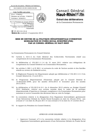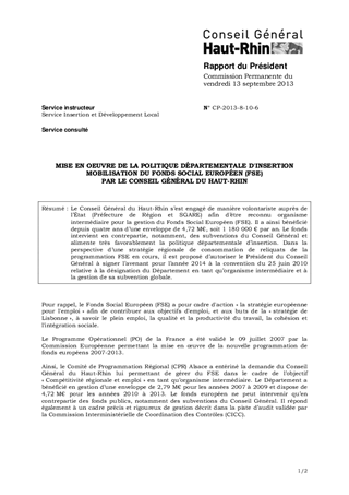 MISE EN OEUVRE DE LA POLITIQUE DÉPARTEMENTALE D'INSERTION MOBILISATION DU FONDS SOCIAL EUROPÉEN (FSE) PAR LE CONSEIL GÉNÉRAL DU HAUT-RHIN