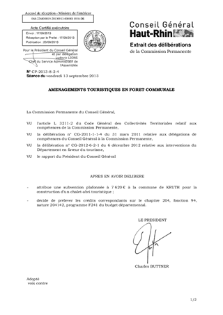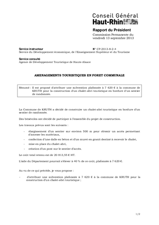 Il est proposé d'attribuer une subvention plafonnée à 7 620 € à la commune de KRUTH pour la construction d'un chalet-abri touristique en bordure d'un sentier de randonnée.
