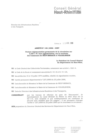 portant réglementation permanente de la circulation sur la RD 1 IV, hors agglomération, sur le territoire des communes de NEUF BRISACH et VOLGELSHEIM. Resumé Pièces jointes ARRETE Assemblée : Non défini Date : 13/04/2006 Rapporteur : Non défini Collectivité : Conseil départemental du Haut-Rhin Direction : Non défini Service : Direction des Routes Domaine : Circulation Commission :