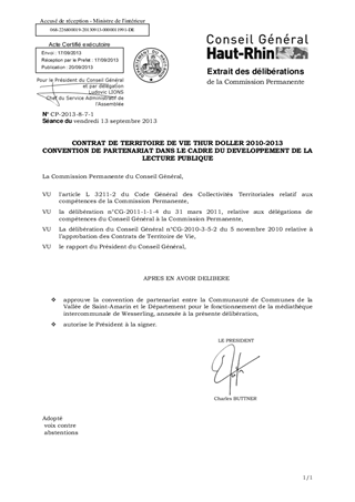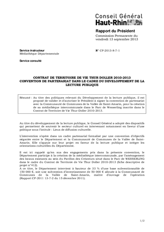 CONTRAT DE TERRITOIRE DE VIE THUR DOLLER 2010-2013 CONVENTION DE PARTENARIAT DANS LE CADRE DU DEVELOPPEMENT DE LA LECTURE PUBLIQUE