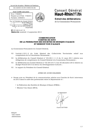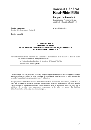 Informations relatives aux Comités de Suivi réunis le 27 mai 2013 dans le cadre de partenariats entre le Département et : - la Fédération des Sociétés de Musique d'Alsace (FSMA) ; - Mission Voix Alsace (MVA).