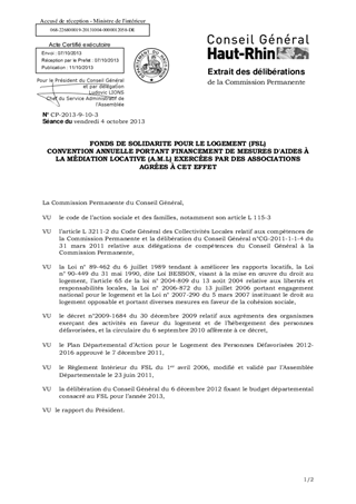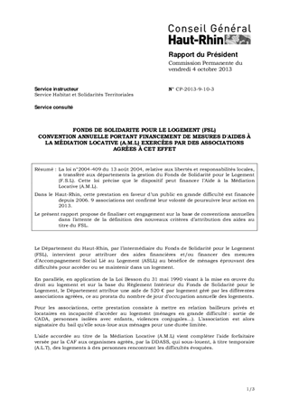 La loi n°2004-409 du 13 août 2004, relative aux libertés et responsabilités locales, a transféré aux départements la gestion du Fonds de Solidarité pour le Logement (F.S.L). Cette loi précise que le dispositif peut financer l’Aide à la Médiation Locative (A.M.L). Dans le Haut-Rhin, cette prestation en faveur d’un public en grande difficulté est financée depuis 2006. 9 associations ont confirmé leur volonté de poursuivre leur action en 2013. Le présent rapport propose de finaliser cet engagement sur la base de conventions annuelles dans l’attente de la définition des nouveaux critères d’attribution des aides au titre du FSL.