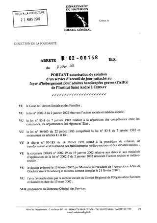 Portant autorisation de création d'un service d'accueil de jour rattaché au foyer d'hébergement pour adultes handicapés graves (FAHG) de l'institut saint André à CERNAY Resumé Pièces jointes ARRETE Assemblée : Non défini Date : 20/03/2002 Rapporteur : Non défini Collectivité : Conseil départemental du Haut-Rhin Direction : Non défini Service : Direction de la Solidarité Domaine : Autres (non classés) Commission :