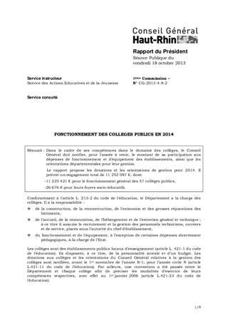 Dans le cadre de ses compétences dans le domaine des collèges, le Conseil Général doit notifier, pour l'année à venir, le montant de sa participation aux dépenses de fonctionnement et d'équipement des établissements, ainsi que les orientations départementales pour leur gestion. Le rapport propose les dotations et les orientations de gestion pour 2014. Il prévoit un engagement total de 11 252 097 €, dont: -11 225 421 € pour le fonctionnement général des 57 collèges publics, -26 676 € pour leurs foyers socio-éducatifs.