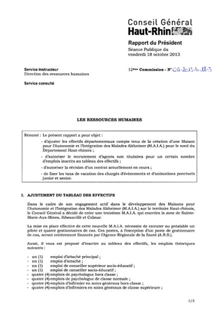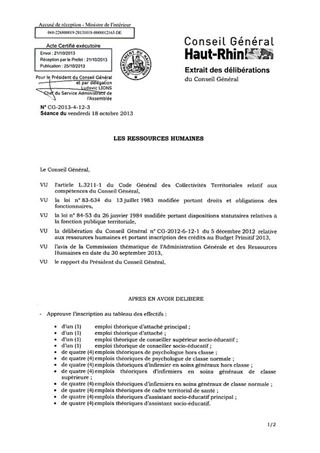 LES RESSOURCES HUMAINES Resumé Pièces jointes DELIBERATION RAPPORT Assemblée : Conseil General Date : 18/10/2013 Rapporteur : Non défini Collectivité : Conseil départemental du Haut-Rhin Direction : Non défini Service : Direction des Ressources Humaines et Dialogue Social Domaine : Administration Commission : Assemblée Départementale