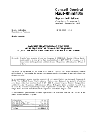 GARANTIE DÉPARTEMENTALE D'EMPRUNT O.P.H. PÔLE HABITAT COLMAR CENTRE ALSACE ACQUISITION AMÉLIORATION DE 4 LOGEMENTS À HERRLISHEIM