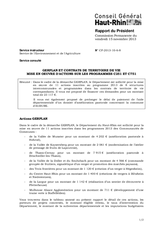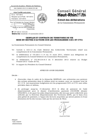 Dans le cadre de la démarche GERPLAN, le Département est sollicité pour la mise en œuvre de 11 actions inscrites au programme 2013 de 8 structures intercommunales et programmées dans les contrats de territoire de vie correspondants. Il vous est proposé de financer ces demandes pour un montant total de 23 117 €. Il vous est également proposé de prolonger le délai de paiement de l’aide départementale d’un dossier d’amélioration pastorale concernant la commune d’AUBURE.