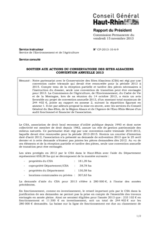Notre partenariat avec le Conservatoire des Sites Alsaciens (CSA) est régi par une convention cadre triennale qui devait être renouvelée pour la période 2013 à 2015. Compte tenu de la réception partielle et tardive des pièces nécessaires à l’instruction du dossier, seule une convention de transition peut être envisagée pour 2013. La Commission de l’Agriculture, de l’Environnement, du Cadre de Vie et de la Montagne, lors de sa réunion du 14 octobre 2013, a émis un avis favorable au projet de convention annuelle 2013, d’un montant total maximum de 244 402 €, jointe au rapport en annexe 2, suivant la répartition figurant en annexe 1. Il est par ailleurs proposé la mise en œuvre, avec les services du Conseil Général du Bas-Rhin, de la Région Alsace et de l’Agence de l’Eau Rhin-Meuse d’un audit fonctionnel et financier de l’association.