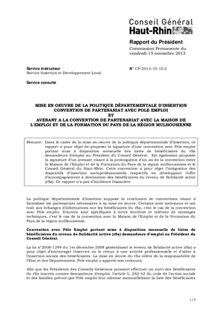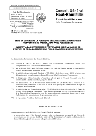 MISE EN OEUVRE DE LA POLITIQUE DÉPARTEMENTALE D'INSERTION CONVENTION DE PARTENARIAT AVEC POLE EMPLOI ET AVENANT A LA CONVENTION DE PARTENARIAT AVEC LA MAISON DE L'EMPLOI ET DE LA FORMATION DU PAYS DE LA RÉGION MULHOUSIENNE