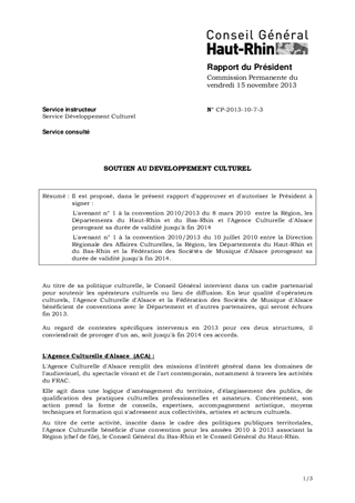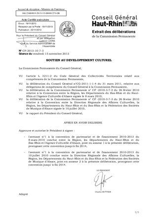 Il est proposé, dans le présent rapport d'approuver et d'autoriser le Président à signer : L'avenant n° 1 à la convention 2010/2013 du 8 mars 2010 entre la Région, les Départements du Haut-Rhin et du Bas-Rhin et l'Agence Culturelle d'Alsace prorogeant sa durée de validité jusqu'à fin 2014 L'avenant n° 1 à la convention 2010/2013 du 10 juillet 2010 entre la Direction Régionale des Affaires Culturelles, la Région, les Départements du Haut-Rhin et du Bas-Rhin et la Fédération des Sociétés de Musique d'Alsace prorogeant sa durée de validité jusqu'à fin 2014.