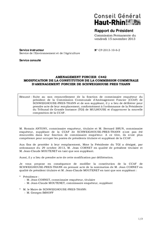 AMENAGEMENT FONCIER C442 MODIFICATION DE LA CONSTITUTION DE LA COMMISSION COMMUNALE D'AMENAGEMENT FONCIER DE SCHWEIGHOUSE PRES THANN