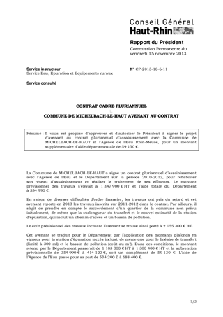 Il vous est proposé d'approuver et d'autoriser le Président à signer le projet d'avenant au contrat pluriannuel d'assainissement avec la Commune de MICHELBACH-LE-HAUT et l'Agence de l'Eau Rhin-Meuse, pour un montant supplémentaire d'aide départementale de 59 130 €.