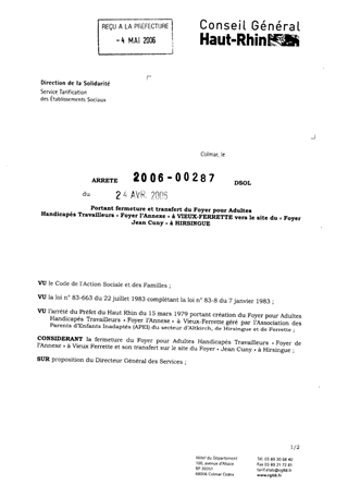 portant fermeture et transfert du foyer pour adultes handicapés travailleurs "foyer l'annexe" à VIEUX FERRETTE vers le site du "foyer Jean Cuny" à HIRSINGUE. Resumé Pièces jointes ARRETE Assemblée : Non défini Date : 24/04/2006 Rapporteur : Non défini Collectivité : Conseil départemental du Haut-Rhin Direction : Non défini Service : Service de la Tarification des Etablissements Domaine : Autres (non classés) Commission :